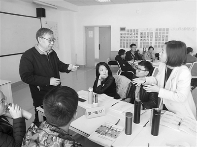 孙康宁教授(左一)在为山东省首届青年教师培训班讲课。 朱征军 摄 |